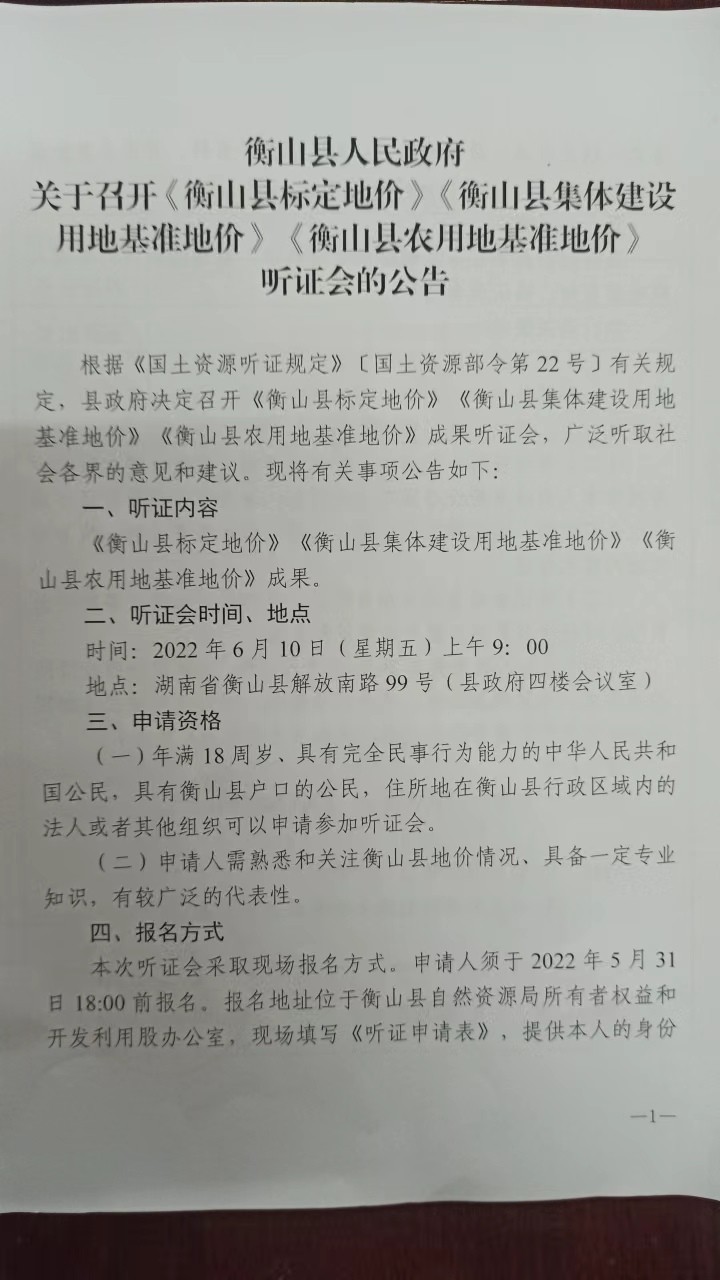 衡山縣人民政府關於召開《衡山縣標定地價》《衡山縣集體建設用地基準地價》《衡山縣農用地基準地價》聽證會的公告