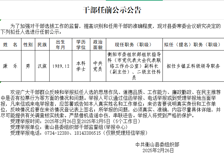 幹部任前公示公告 (2025年2月26日)