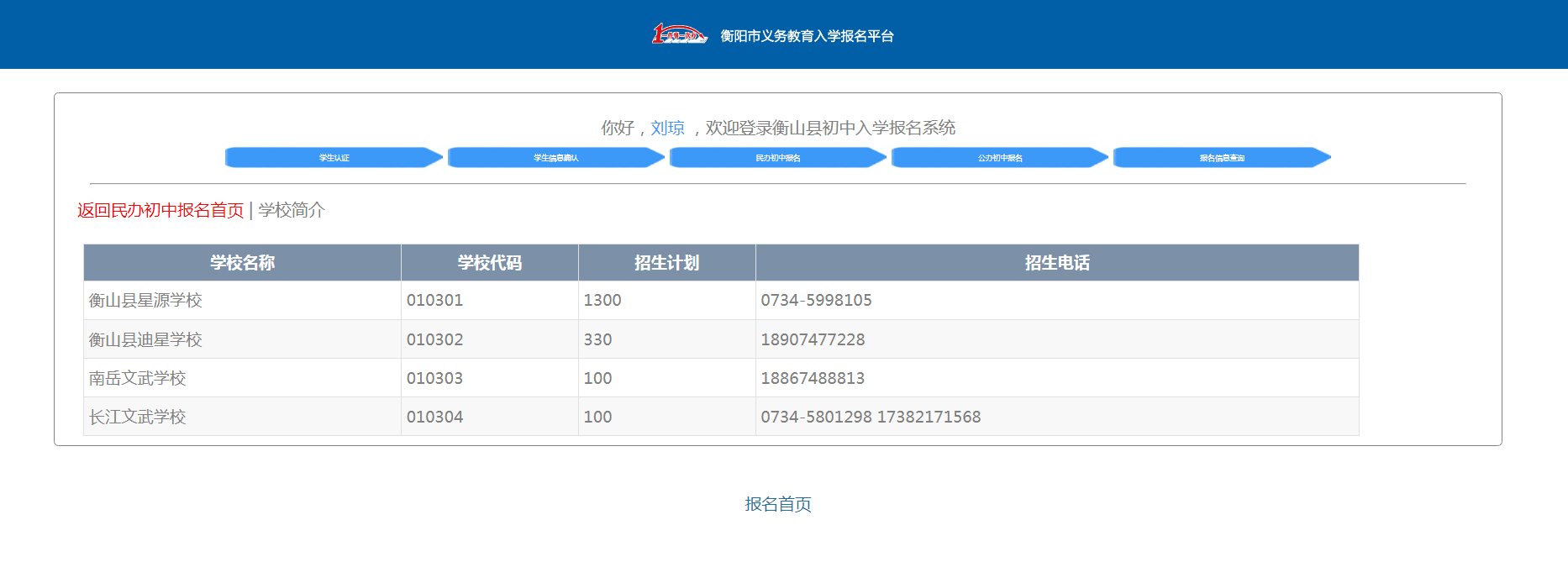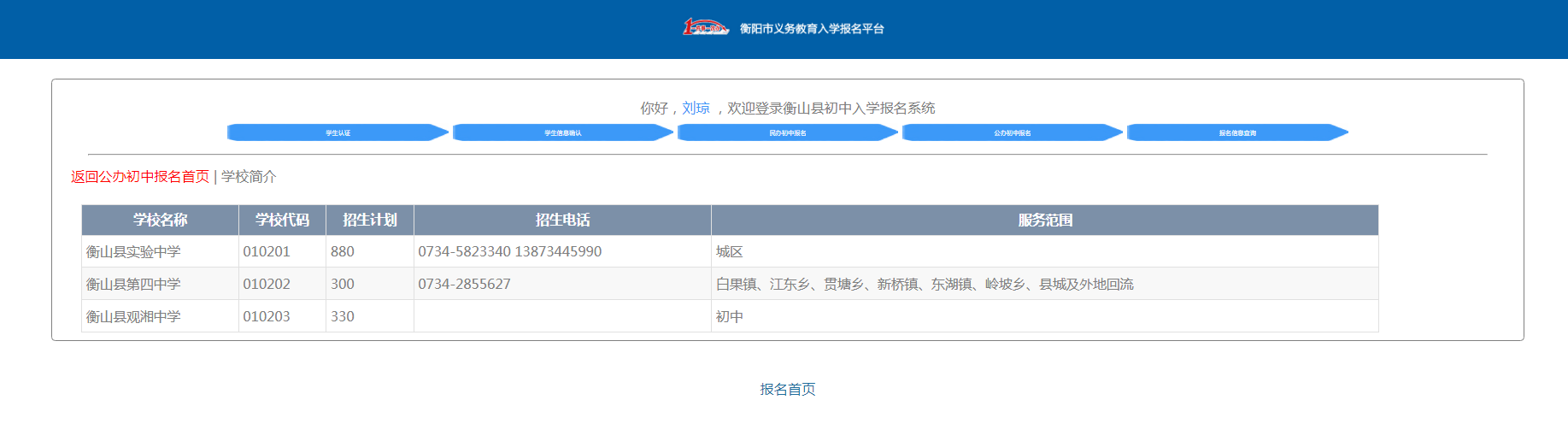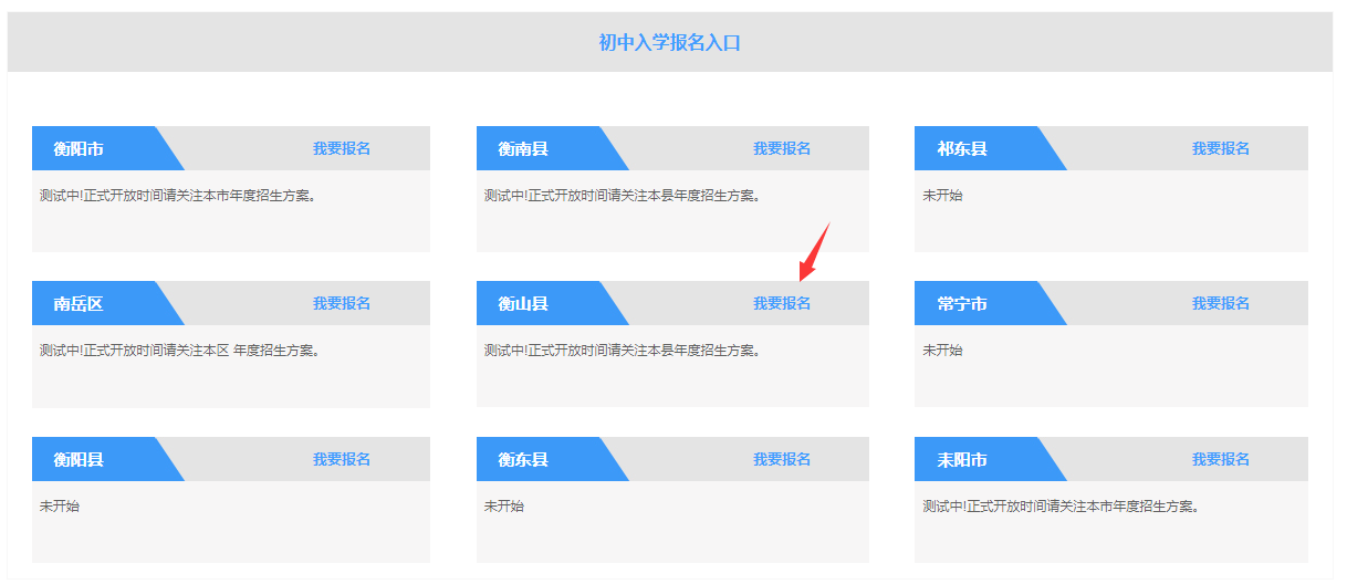學生家長實名注冊用戶並登錄,選擇行政區劃"衡陽",進入縣/市招生平台匯聚,選擇衡山縣初中入學報名係統進行報名。