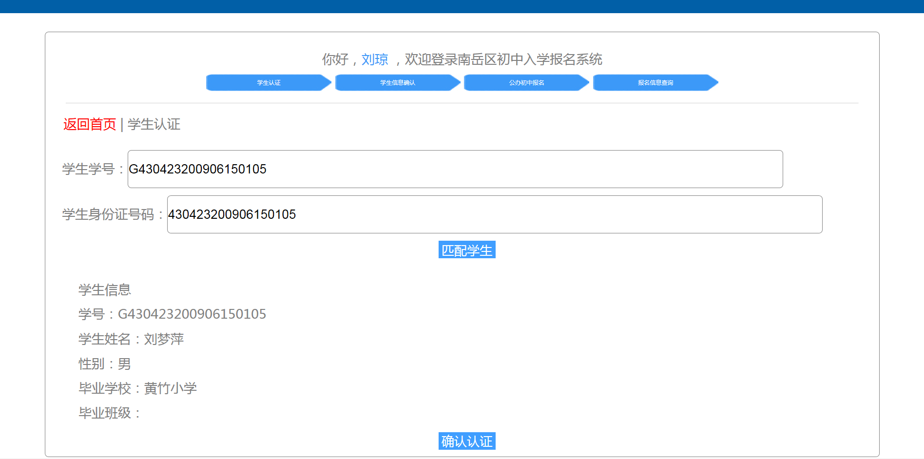 輸入學生學號及身份證號碼,點擊匹配學生。