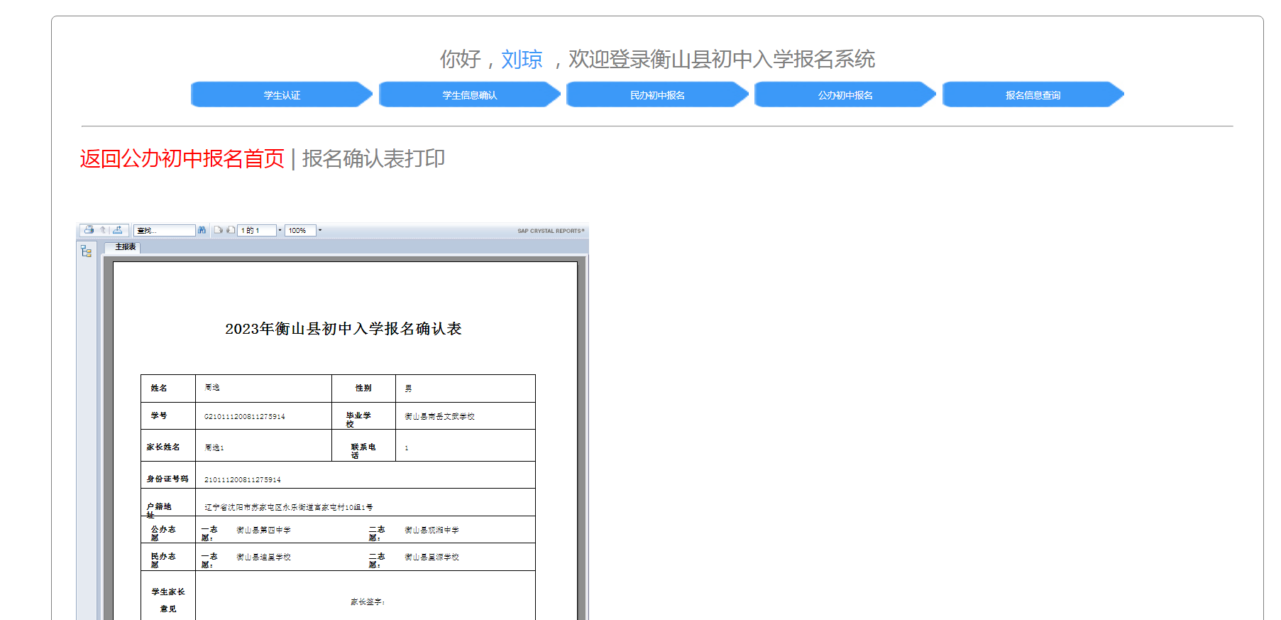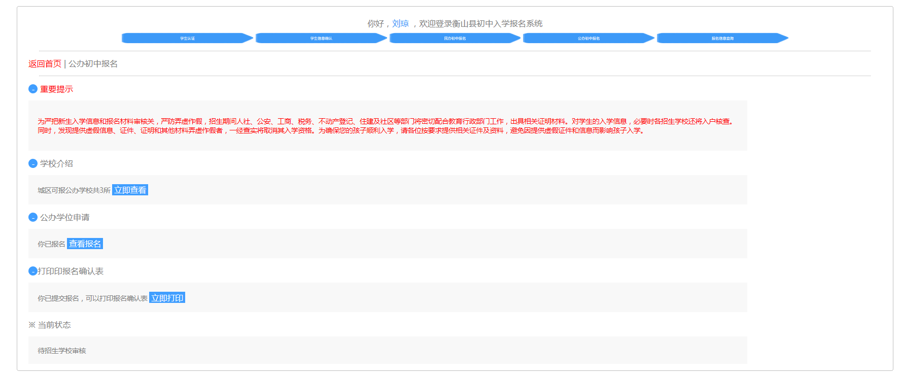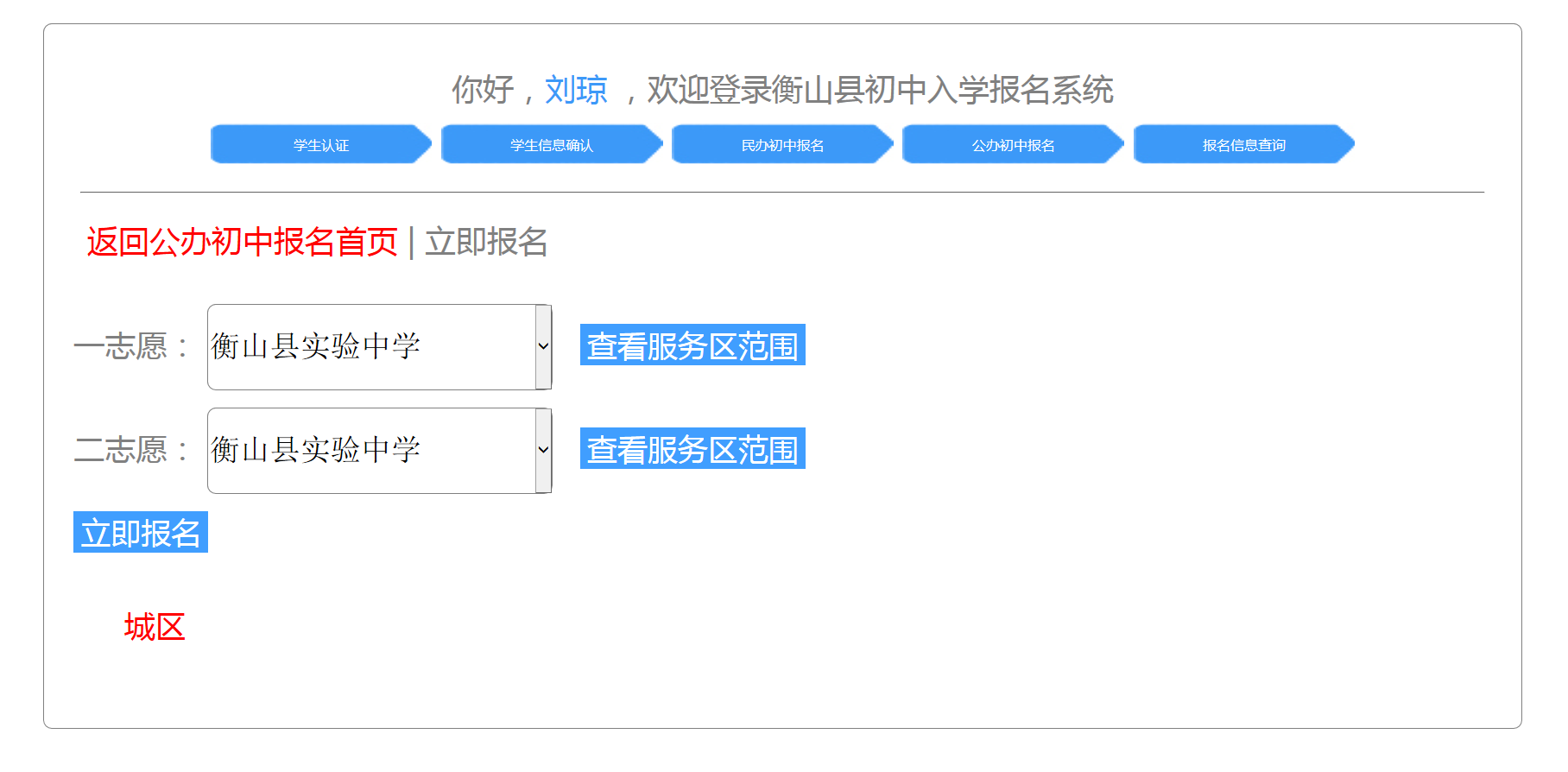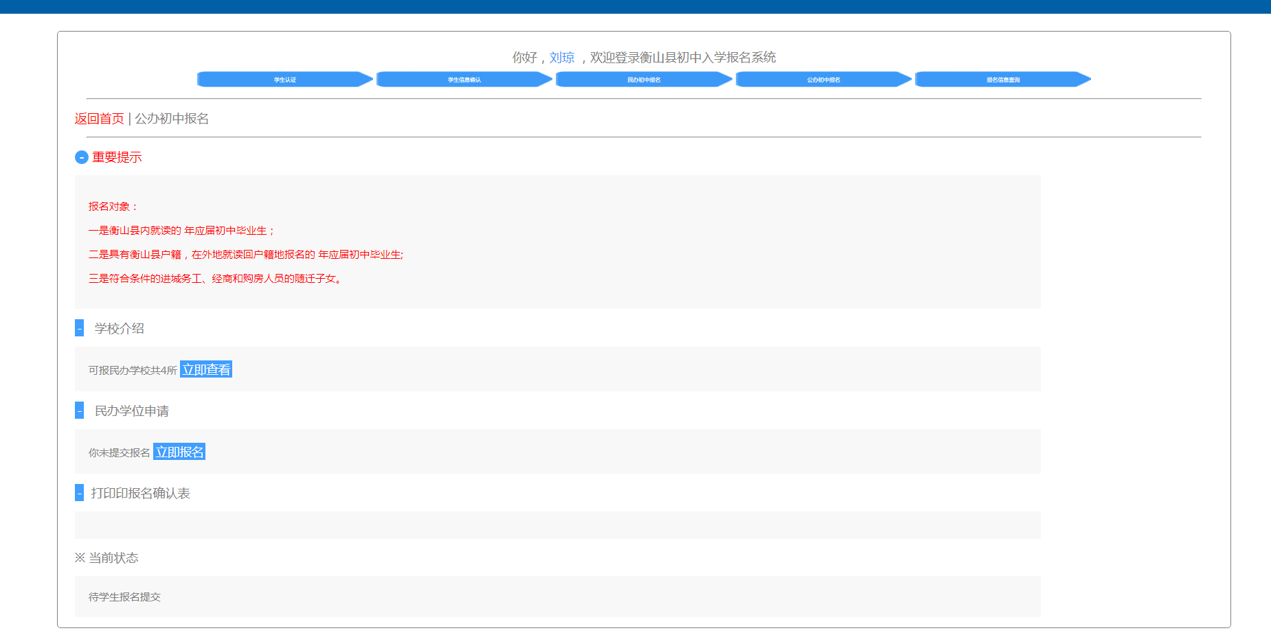 衡山縣初中入學報名係統操作手冊 (學生)