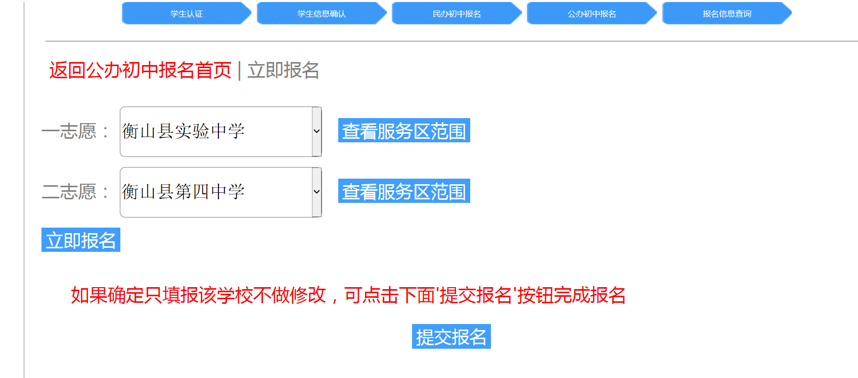 選擇好一、二誌願學校後,點擊"立即報名",如無需修改報名學校,點擊"提交報名"。