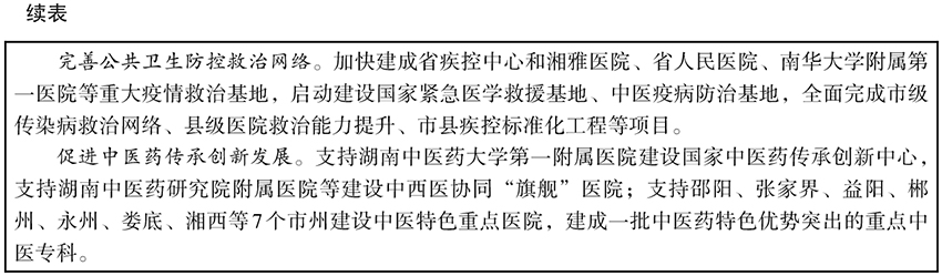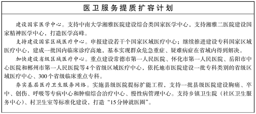 (二)推動醫衛服務提質擴容。順應城鎮化人口流動趨勢,以建設國家醫學中心和國家區域醫療中心為牽引,健全與城市發展和人口流動相匹配的省、市、縣、鄉(鎮)、村級醫療衛生服務網絡,到2025年,每千人口執業(助理)醫師數達3.2人,基本建成體係完整、布局合理、分工明確、功能互補、密切協作、運行高效、富有韌性的優質高效整合型醫療衛生服務體係。(牽頭單位:省衛生健康委、省發展改革委;責任單位:省財政廳、省科技廳、省中醫藥局、省醫保局,市州人民政府)