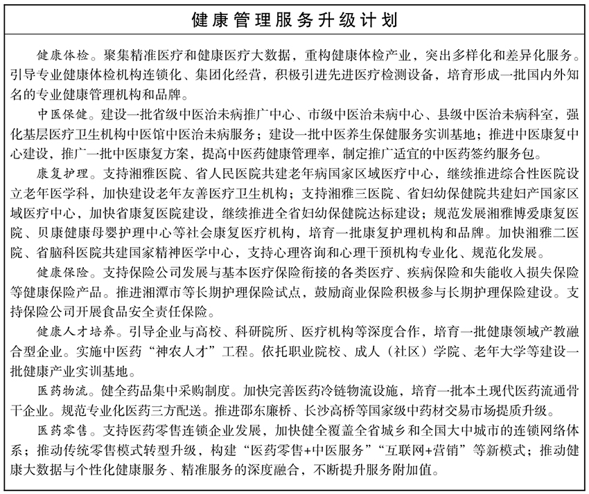 (四)推動健康管理服務升級。鼓勵公立醫院與社會資本合作開展健康管理服務,發展以健康風險管理為核心的健康管理新型組織。提升省、市、縣三級中醫藥治未病、中醫藥康複服務能力。創新慢病康複療養、健康跟蹤管理和孕產婦、嬰幼兒健康護理,加強特殊群體心理健康服務。促進商業健康保險與基本醫保互補銜接,推進長期護理保險試點。推動健康產業實用技術技能人才產教融合實訓基地建設。加強現代藥品流通網絡建設。(牽頭單位:省衛生健康委;責任單位:省民政廳、省中醫藥局、湖南銀保監局、省地方金融監管局、省發展改革委、省人力資源社會保障廳、省教育廳、省市場監管局、省藥監局,市州人民政府)