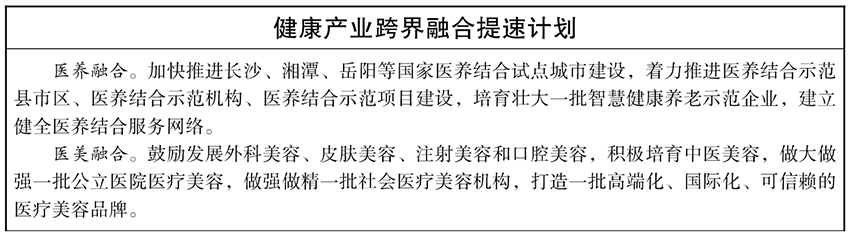 (五)推動健康產業跨界融合提速。實施醫養結合示範工程和社區醫養結合能力提升工程,積極推進智慧康養應用試點示範。著力發展醫療美容服務業,完善醫療美容服務體係。鼓勵優質醫療機構、旅遊服務機構和旅遊休閑基地深度合作,積極建設國家中醫藥健康旅遊示範區(基地)。依托豐富旅遊資源和特色自然生態資源,實施“森林康養+”行動,推動康旅康養融合。圍繞慢性病預防、運動康複、健康促進等,深入推動醫體融合。(牽頭單位:省衛生健康委;責任單位:省民政廳、省文化和旅遊廳、省中醫藥局、省體育局、省藥監局、省林業局,市州人民政府)