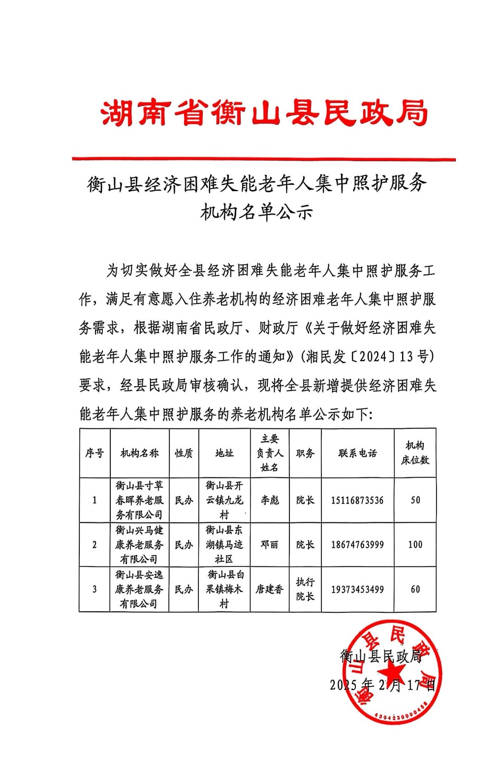 衡山縣經濟困難失能老年人集中照護服務機構名單公示