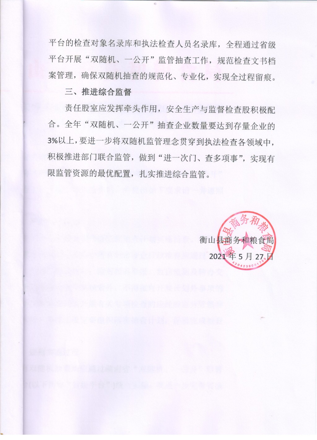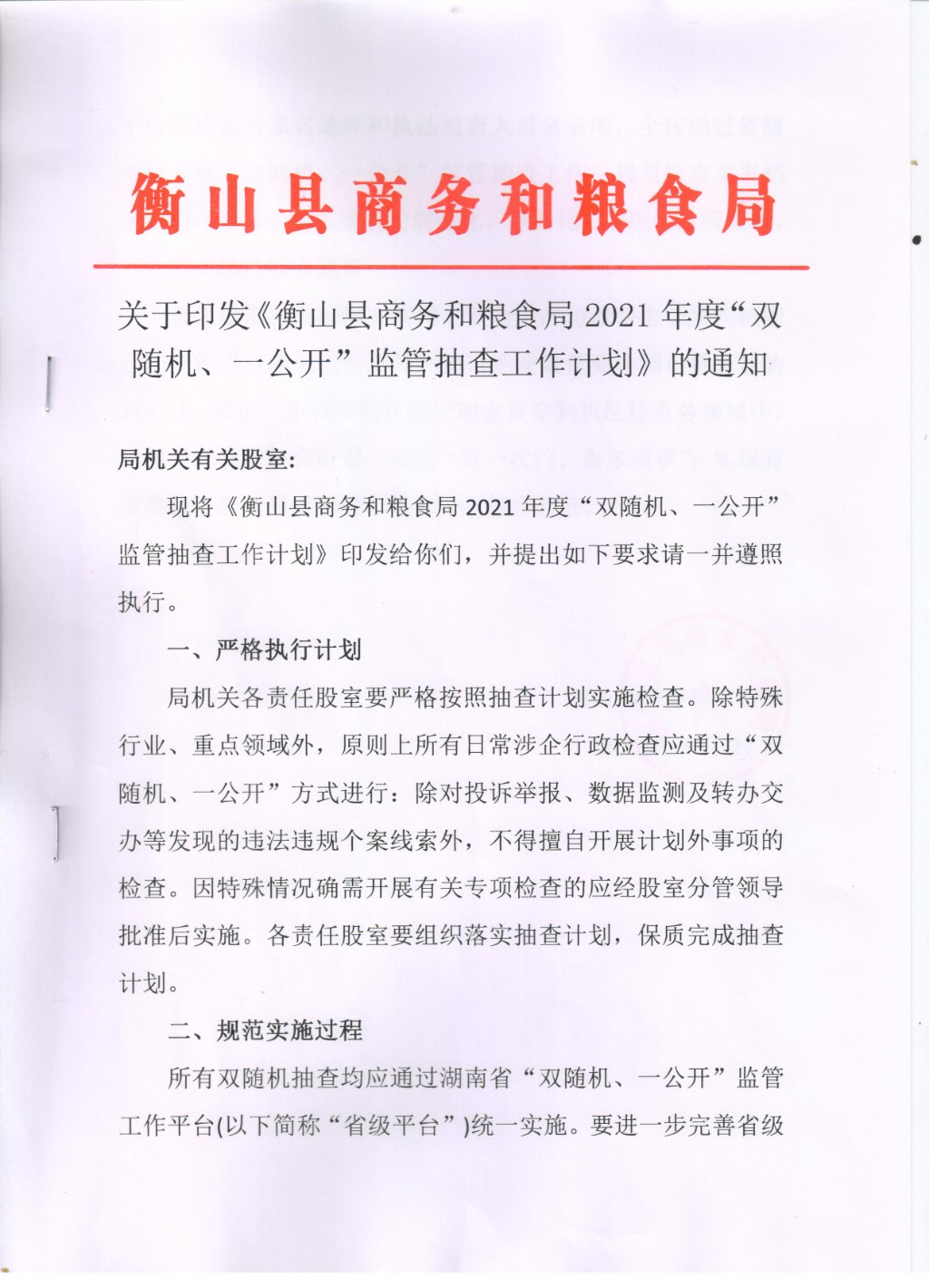 關於印發《衡山縣商務和糧食局2021年度“雙隨機、一公開”監管抽查工作計劃》的通知