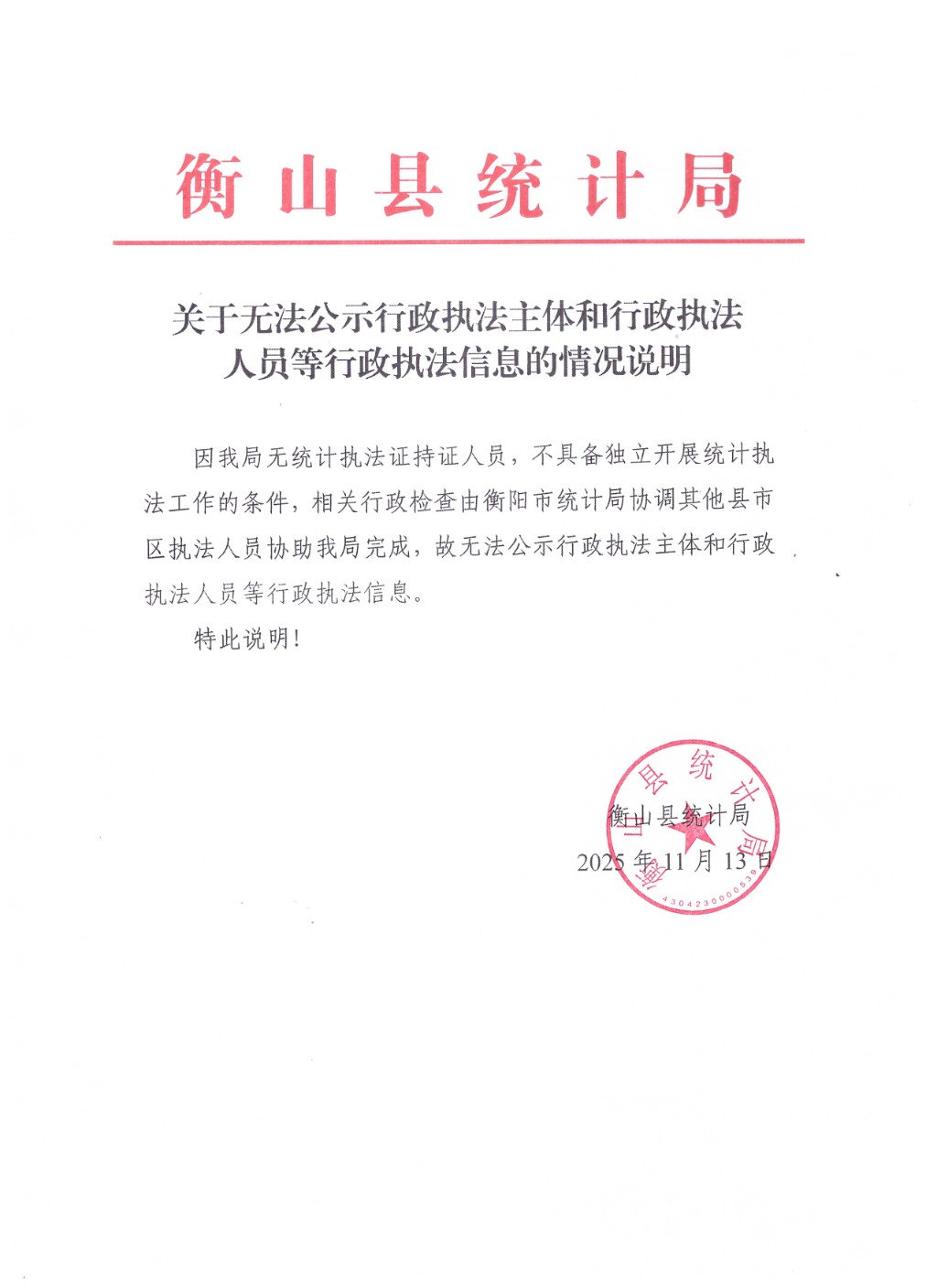 衡山縣統計局關於無法公示行政執法主體和行政執法人員等行政執法信息的情況說明