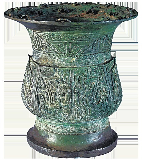 1963年出土於湖南衡山霞流,現收藏於湖南博物院的蛇紋銅尊,是湖南出土的一件具有代表性的蛇紋文物。這件春秋時期的尊,高21厘米,作為酒器,其造型古樸典雅。此種形製的尊,在中原地區常見於西周時期,而在湘江流域,卻姍姍來遲,直至東周時期才現身。此尊的裝飾較為特殊,頸部和圈足飾分割成三角形的幾何紋,腹部飾蛇紋,每一組的邊緣飾有鱷魚紋。口沿飾一周首突起、身尾臥伏於器壁上的蛇紋,多做兩頭相對,其中一處三頭相對,是目前僅見的一件口沿處作如此裝飾的尊。