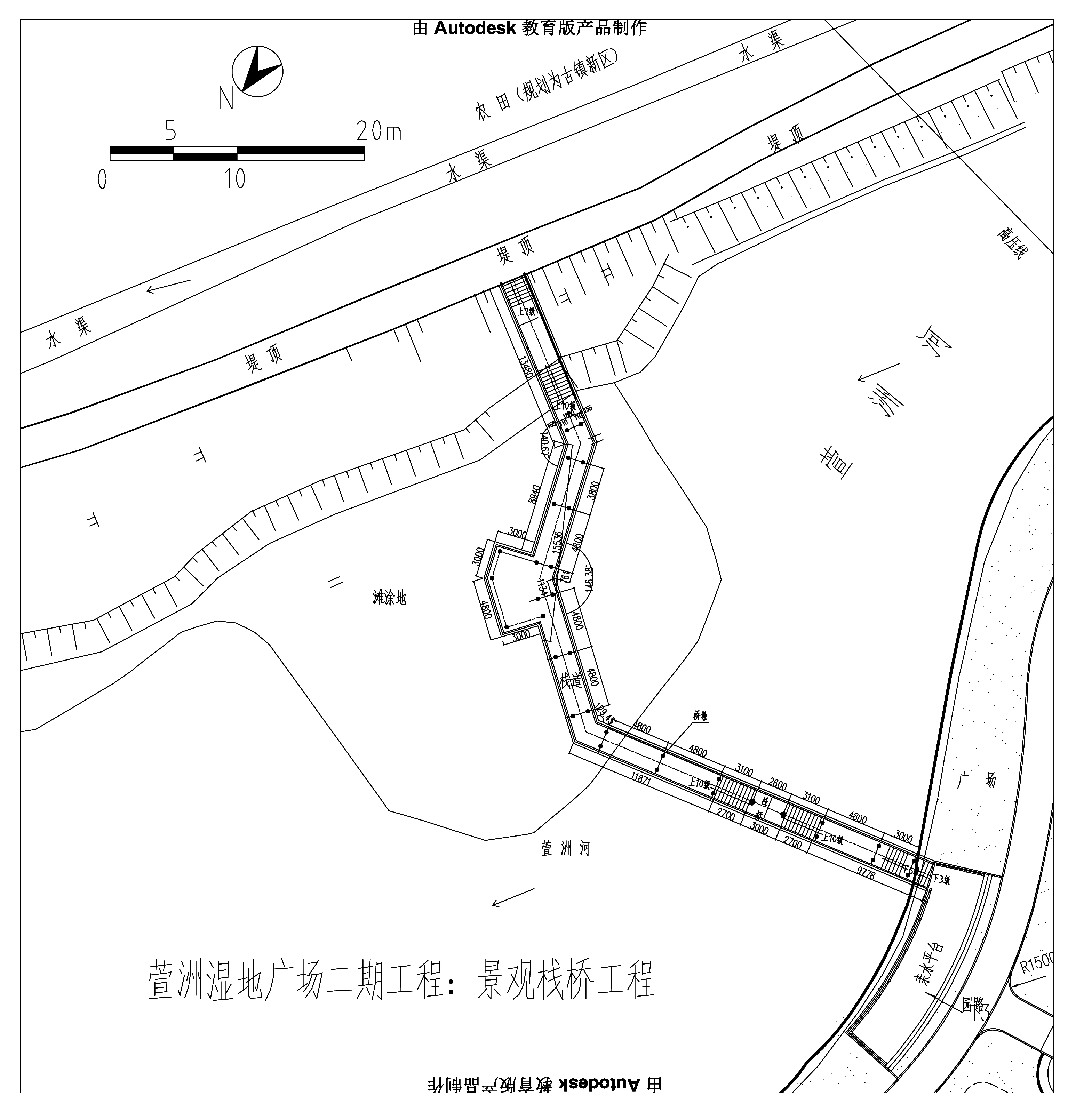 本次設計項目為湖南衡山萱洲國家濕地公園濕地廣場二期工程(巡護道路工程),是萱洲濕地廣場的一部分,位於廣場東側,跨越萱洲河,巡護棧道棧橋一般寬度為2.4m,長度約為67m,總麵積約為182m2(包括巡護棧道、休息棧台等)。整個工程是鏈接濕地廣場與對麵河堤的重要通道,為遊客、周邊村民及今後古鎮新村的居民通行提供了便利。本設計呼應周邊濕地景觀,融合萱洲河流及原有灘塗濕地,設計了棧橋、棧道、休息棧台、親水觀景平台及其他公用配套設施,將人工構築物融入自然環境,讓遊客有更多"親水觀水"的遊賞體驗。