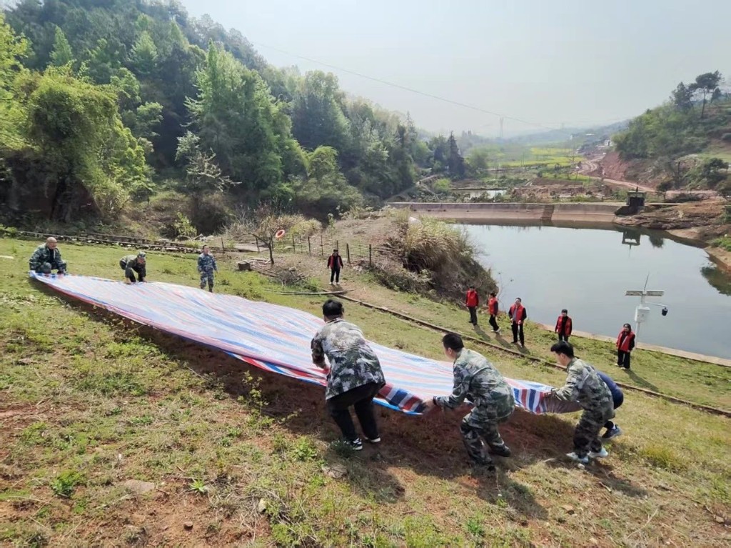 防汛演練階段模擬因連日強降雨水庫水位暴漲,堤壩出現湧洞。上午10時,鎮政府接到萱洲河社區應急信息員報告鳳鳴水庫可能發生汛情,危及周邊居民生命財產安全。鎮政府迅速組織各應急小組做好搶險救災準備,趕赴現場疏散周邊群眾,後勤保障組向受災居民發放食品飲用水等必須物資,安撫群眾情緒。應急小組立即進行搶險,裝送沙土對堤壩湧洞進行填補加固,同時繼續排查水庫堤壩隱患和觀測汛情,確保堤壩安全後,有序撤離。