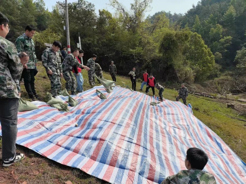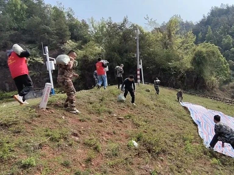 地質災害演練階段采取模擬演練的方式,假想背景設定在居民屋後發現一處滑坡險情,各搶險小組各司其職、高效聯動,迅速勘探劃定了地質災害危險區,拉起警戒線,設立警示標誌,轉移撤離周邊群眾,設置臨時安置點,通過一係列的應急搶險措施,高效有序地完成了地質災害應急處置。