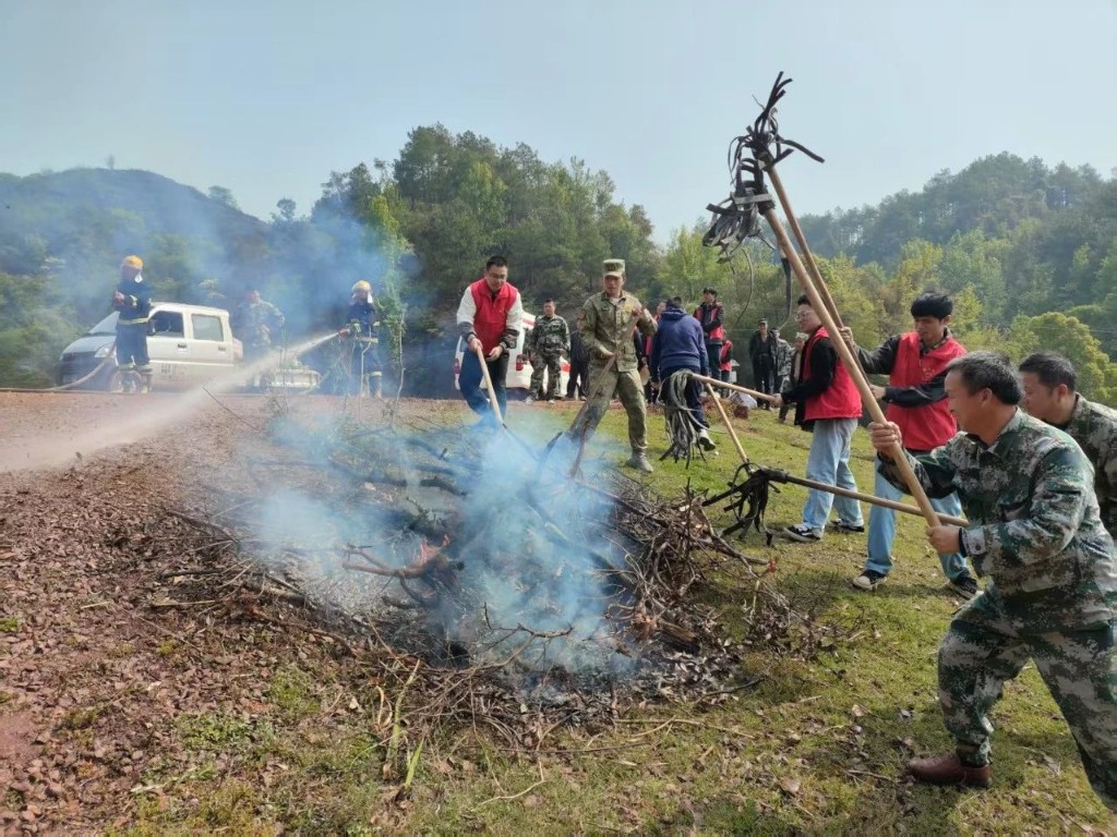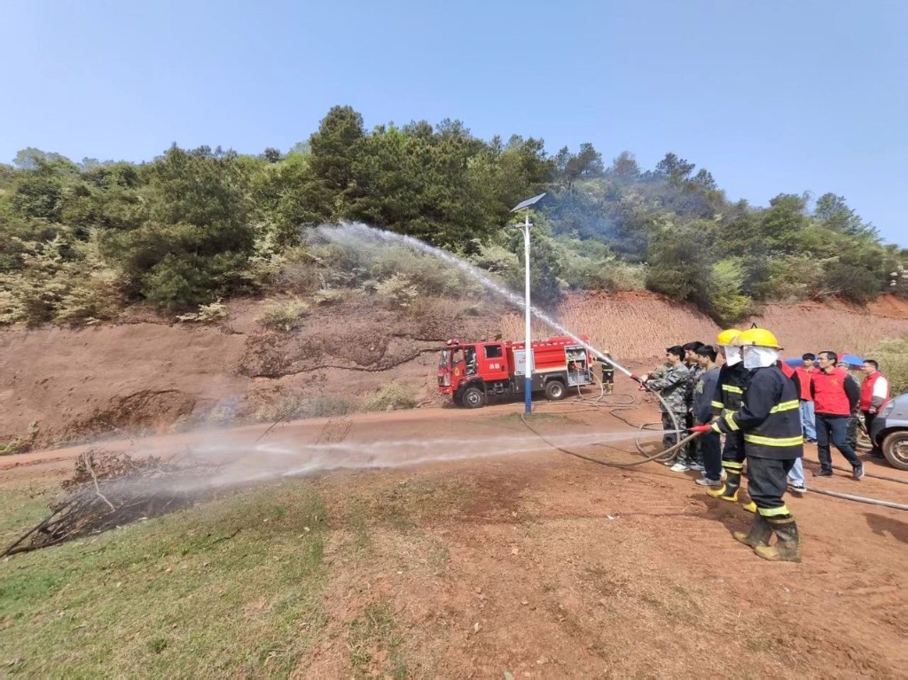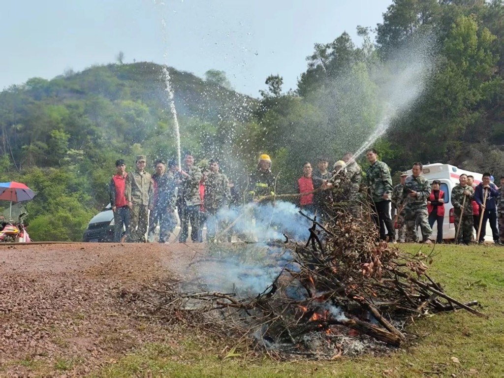 防火演練階段采取實操演練的方式,設置野外火場一處。隨著急迫的敲鑼聲響起,鎮微型消防站和應急小組成員迅速前往火場,各組聯動,運用高壓水槍、撲火掃把、噴霧滅火器等消防設備迅速撲滅了火情,同時做好了安全疏散、現場清理、留觀值守等後續工作,默契配合,演練圓滿完成。